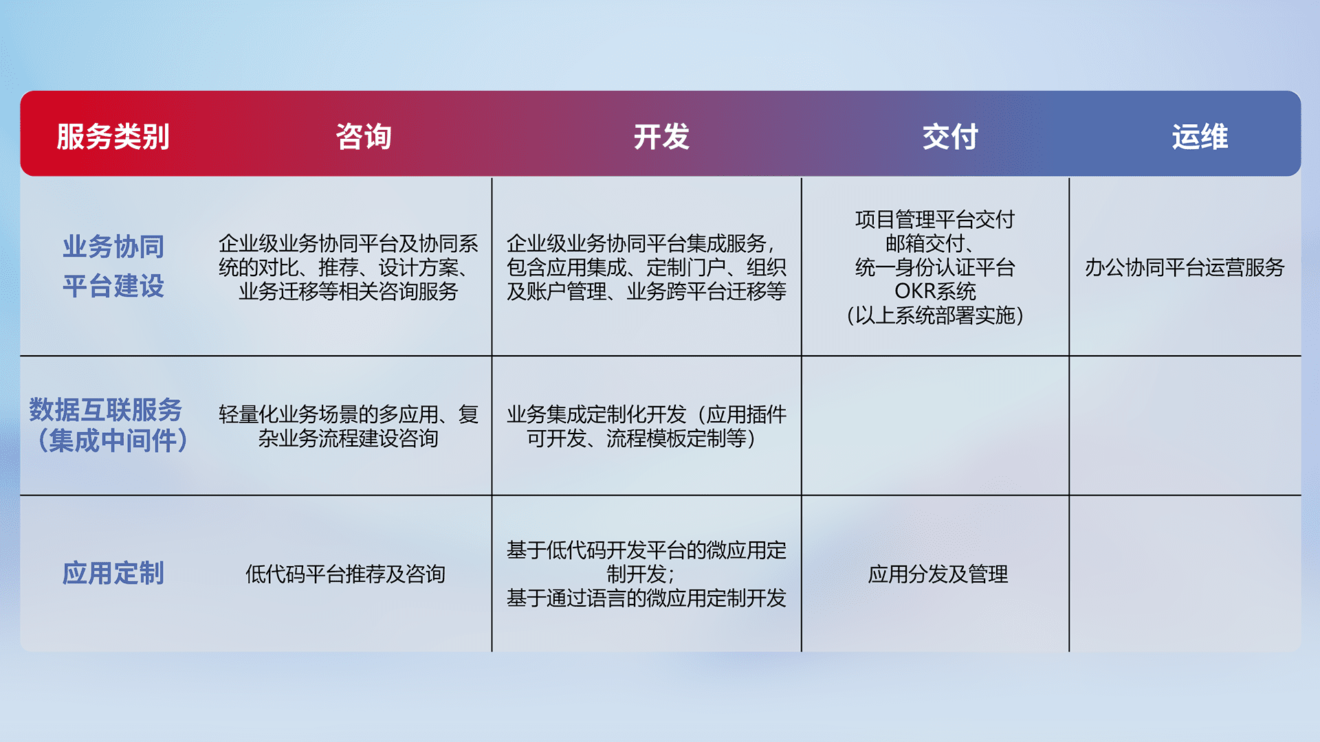 针对钉钉、、、企微、、、IDaas等平台级产品提供产品的规划、、、方案、、、、交付、、定制化开发等服务,,,实现如统一协同办公、、、智能客户服务、、、混合会议管理、、、、智能数据查询、、等业务场景,,,实现数字化转型。。。